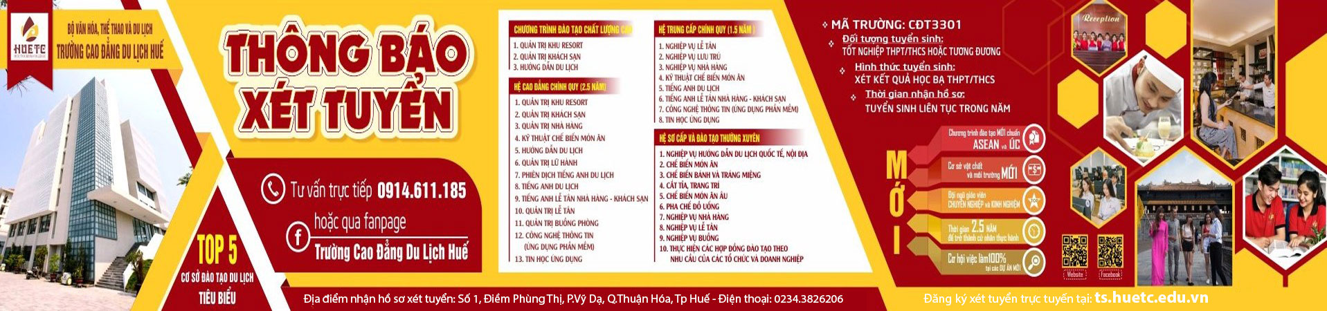 Mã trường: CĐT3301 Địa chỉ: Số 01 Điềm Phùng Thị, phường Vỹ Dạ, Thành phố Huế. Điện thoại: 0234.3826 206; 0234.3824 832. Hotline: 0914 611 185. Facebook: Trường Cao Đẳng Du Lịch …